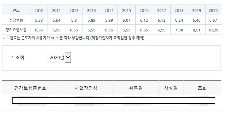 원하는 해당 연도를 선택 후에 조회 부분을 클릭하면 평균월보수액과 산정 보험료 등의 정보가 나타나다.
