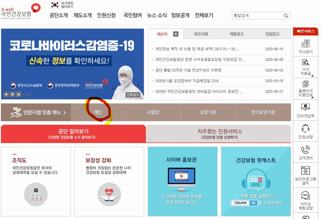 국민건강보험공단 홈페이지에 접속한다.