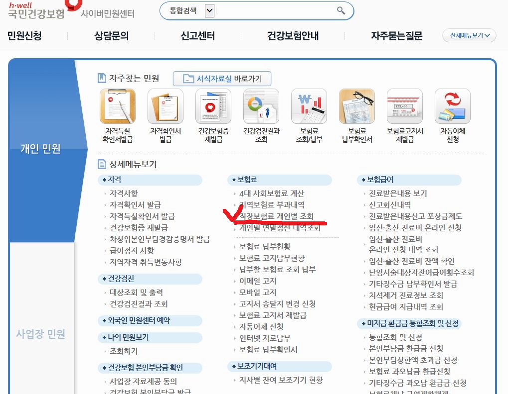 사이버민원센터 페이지에서 체크 표시된 보험료 항목 중 '직장보험료 개인별 조회'를 클릭한다.