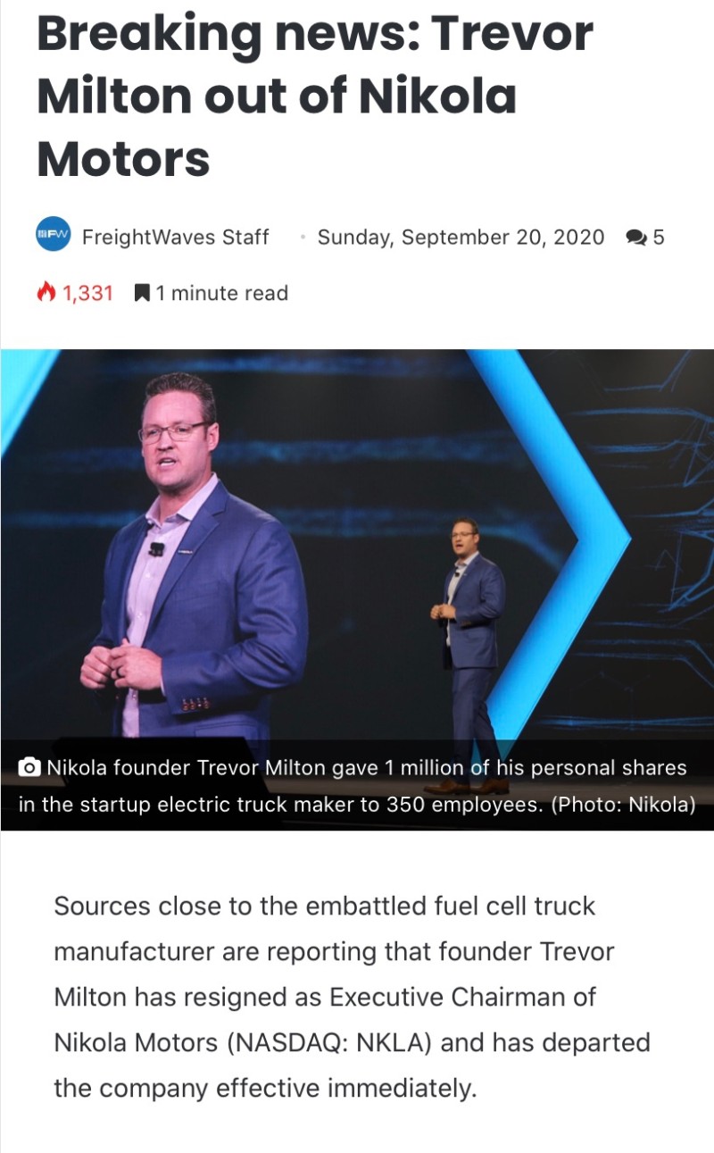 며칠동안 '사기' 논란으로 시끄러웠던 니콜라의 트레버 밀턴 CEO가 전격 사퇴했다.